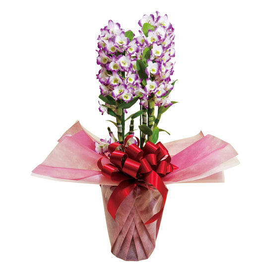 喜寿(77歳)のお誕生日は、人生の大切な節目を祝う特別な日です。胡蝶蘭は「幸福が飛んでくる」という花言葉を持ち、上品で長く楽しめる贈答花として最適です。紫系の色合いは長寿祝いの伝統にも通じ、感謝と敬意を込めた贈り物として喜ばれます。
